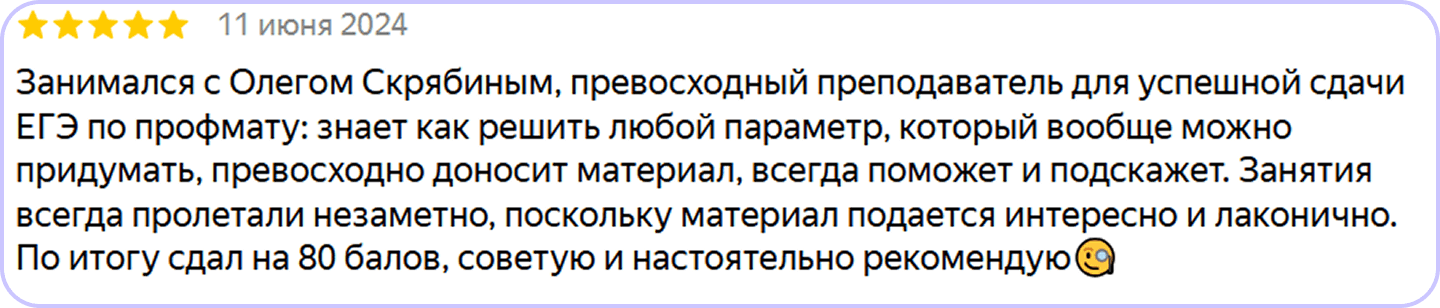 Готовит учеников к ОГЭ, ЕГЭ, олимпиадам и вступительным экзаменам в ведущие ВУЗы России и зарубежья, включая МГУ, СПбГУ, МФТИ, МГТУ им. Н.Э. Баумана, ВШЭ и другие.