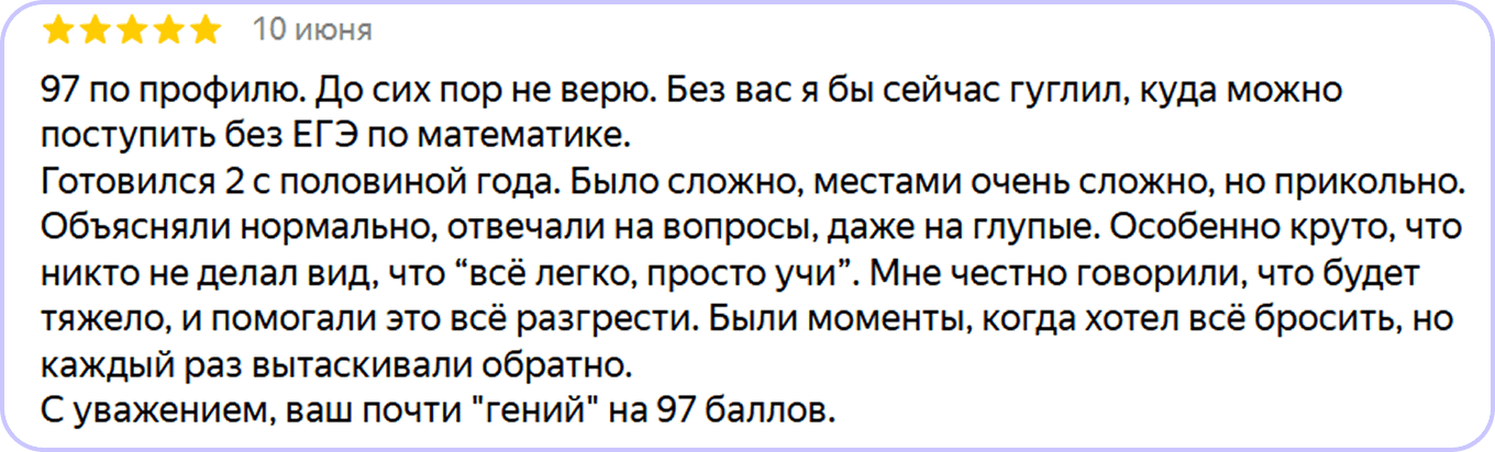 Понимаем ваши переживания. Они абсолютно естественны, особенно когда речь идёт о сдаче экзаменов. Хотим лишь отметить, что сейчас вы уже ходите на очные занятия практически каждый день в школу и не получаете желаемого результата. Вы можете почитать о нас отзывы и принять для себя верное решение